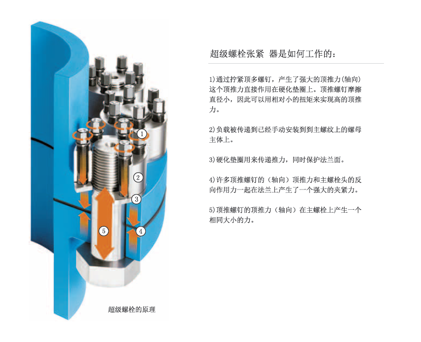 超級(jí)螺栓張緊器被設(shè)計(jì)來(lái)直接取代傳統(tǒng)的螺母和螺栓。這些裝置可以旋合于一個(gè)新的或者現(xiàn)有的螺栓,螺柱,螺桿或者軸上。主螺紋用于安置緊張器在螺栓或者螺柱上并靠在硬化墊圈及承載面上,一旦安置到位,螺栓或者螺柱的實(shí)際的張緊通過(guò)簡(jiǎn)單的手動(dòng)工具來(lái)擰緊環(huán)繞主螺紋一圈的頂推螺釘來(lái)實(shí)現(xiàn)。頂推螺釘均勻地傳遞預(yù)緊力到主螺紋上,從而,也傳遞到連接件上。主螺紋被純張力鎖緊。