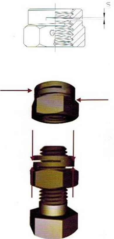 開槽鎖緊螺母的鎖緊槽經(jīng)精密加工而成,使內(nèi)螺紋產(chǎn)生一定的螺距差。當(dāng)螺栓旋入時,內(nèi)螺紋回復(fù)原有螺距,發(fā)生彈性形變產(chǎn)生的彈性力將內(nèi)外螺紋緊密嚙合,使螺母牢固的自鎖在螺栓上有一種對稱開槽的設(shè)計,可使鎖緊力均衡分布在紋上,使嚙齒更緊密,適合于震動更劇烈的應(yīng)用.